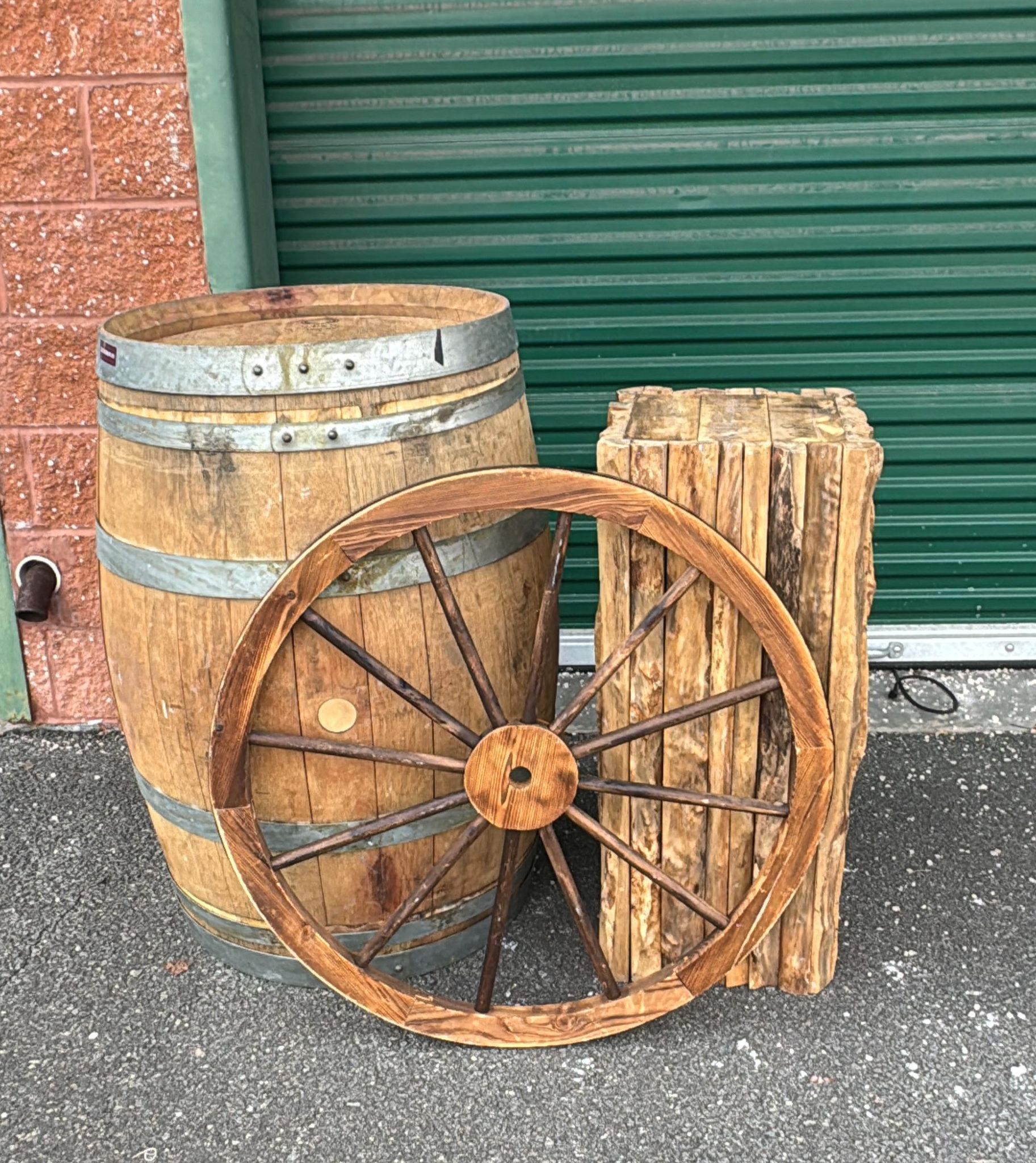 Premium rustic event décor package featuring a natural wooden barrel, solid rustic pedestal, and classic wooden wagon wheel. Perfect for weddings, outdoor celebrations, barn-style events, and upscale rustic themes in Woodbridge, NJ and Central New Jersey.